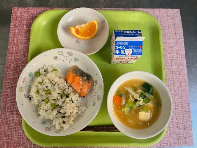 グリンピースごはん、鮭の塩こうじ焼き、新玉葱のみそ汁、清美オレンジ、牛乳