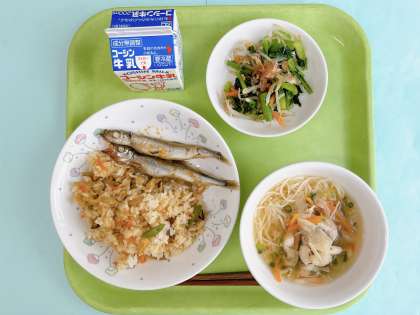 とふめし、ししゃもの甘辛焼き、小松菜のお浸し、ばち汁、牛乳