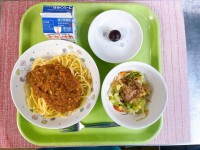 【献立】 スパゲッティーミートソース、りっちゃんの元気サラダ、巨峰、牛乳【ひとこ...