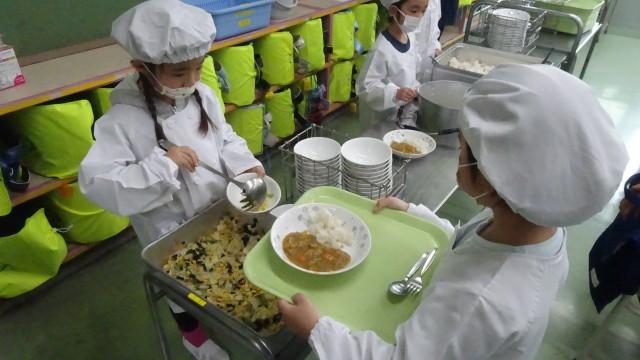 今日から1年生の給食がスタートしました。 今日の献立は、牛乳、カレーライス、和風サラダです。準備の時間になると、給食当番は白衣と帽子を身にまとい、どの子もやる気いっぱい! 待っている子たちも、静かにお行儀よく待つことができました。配膳から後片付けまで、給食には覚えることがたくさんありますが、先生の話をよく聞いて、慎重におかずを盛り付けたり、おぼんを運んだりすることができました。「いただきます!」の後は、あちこちから「おいしい!」の笑顔がこぼれました。 これから6年間続く給食の時間が、子どもたちにとって「たのしく、おいしい」ひとときとなるよう見守っていきたいと思います。