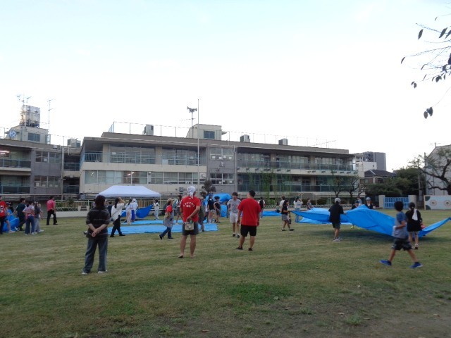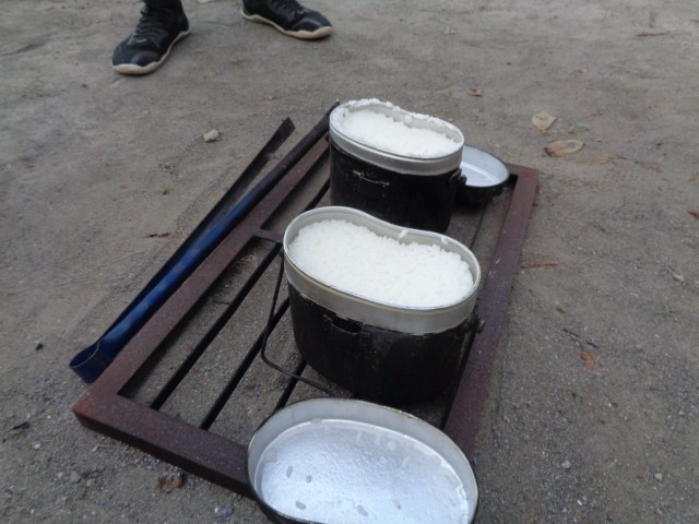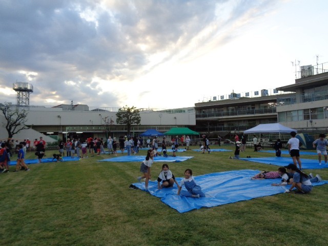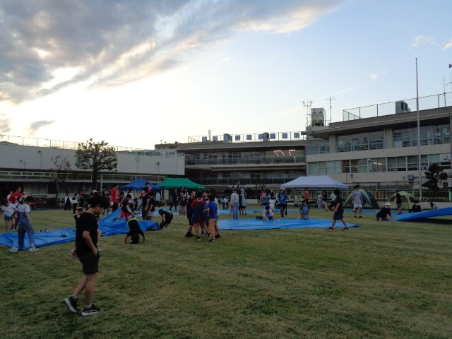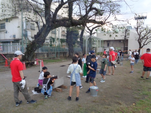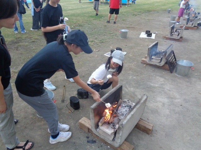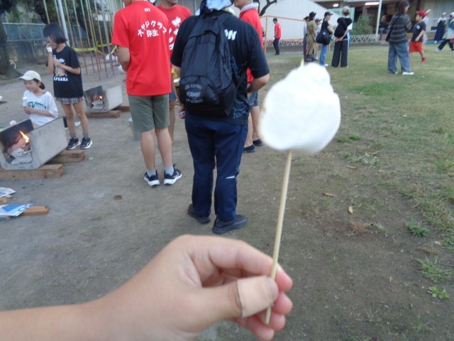 飯ごうで炊いたご飯ができ上がりました。1班の炊き上がりを見せてもらいましたが、とってもおいしそうに炊き上がっています。ご飯が炊けた後の残り火で子どもたちは焼きマシュマロを食べていました。子どもたちはみんなで食べるために大きなビニールシートを広げています。こんなことも楽しそうにやるのが弥生小学校の子どもたちのすてきなところですね。