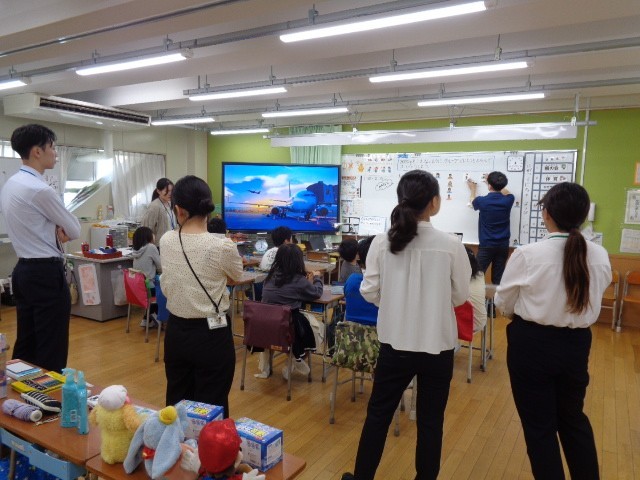 今日の5時間め、上板橋地区の若手教員の皆さんの研修である「上板プラン」の模範授業が弥生小学校の五組で行われました。