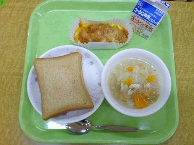 今日の給食の「ポテトのミートグラタン」は、やわらかくしたじゃがいもに、時間をかけて煮込んだミートソースと、チーズをかけてオーブンで焼き上げました。給食室では、紙カップにひとつずつ手作りをするので、少し時間がかかるメニューですが、子どもたちには人気のメニューのひとつです。