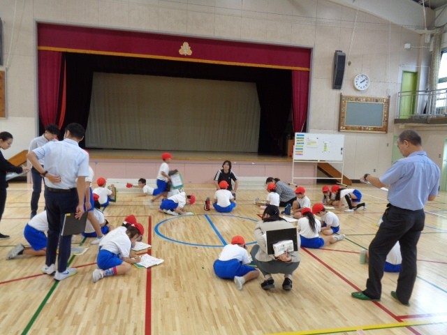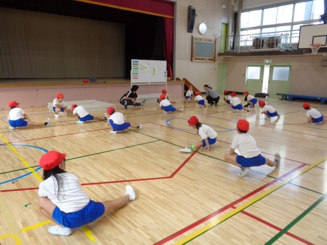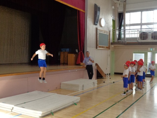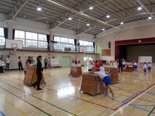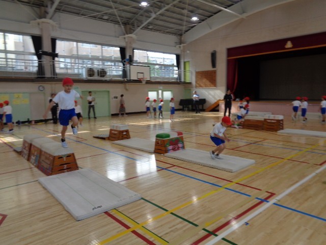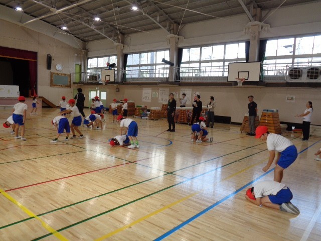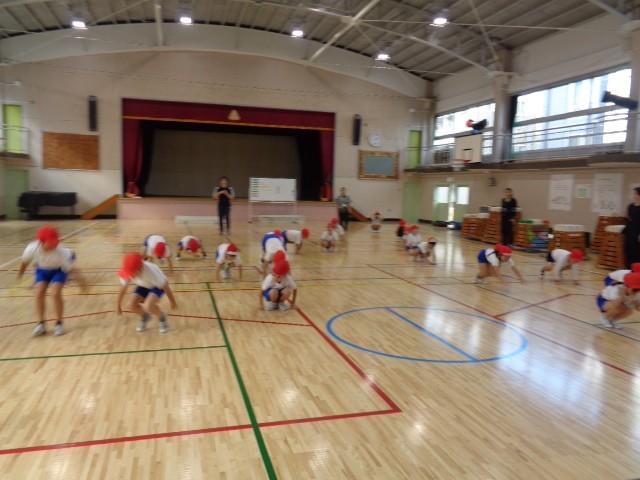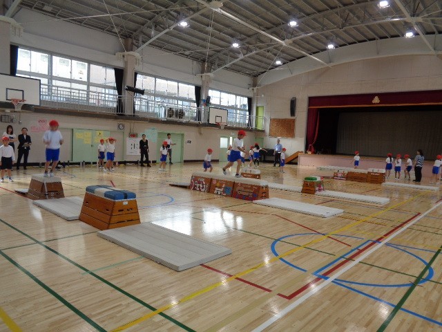 今日の5時間めは、今年度3回目の校内研究会研究授業で、2年1組の体育「跳び箱を使った運動遊び」の最後の時間でした。たくさんの先生方が見ている中でちょっと緊張気味の子どもたちでしたが、とても意欲的に活動し、自分たちが工夫した技に一生懸命に取り組んでいました。