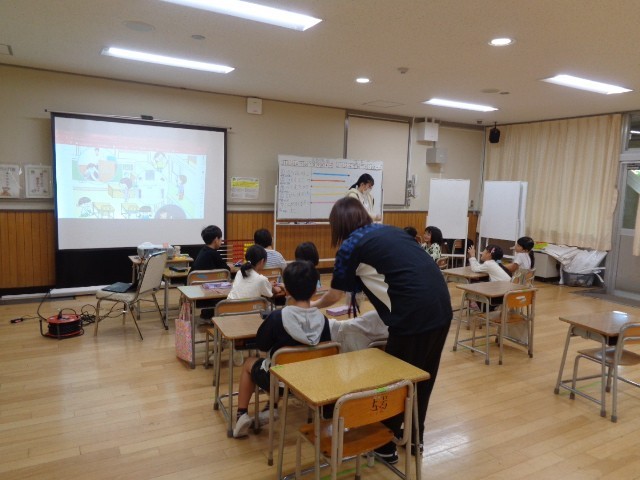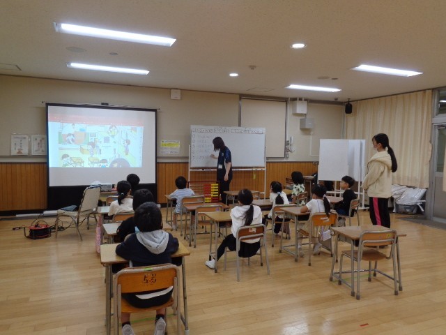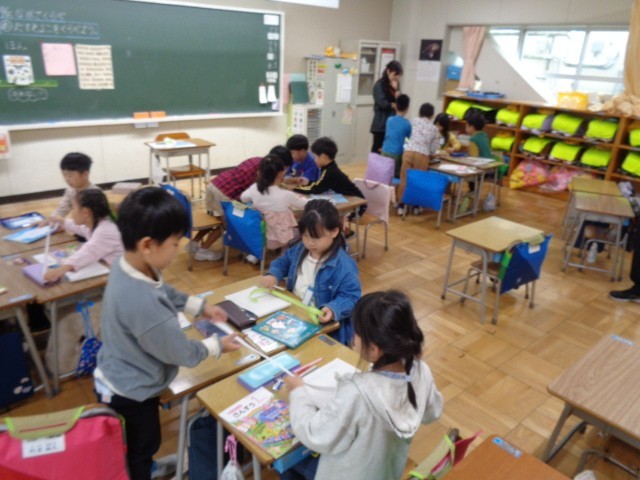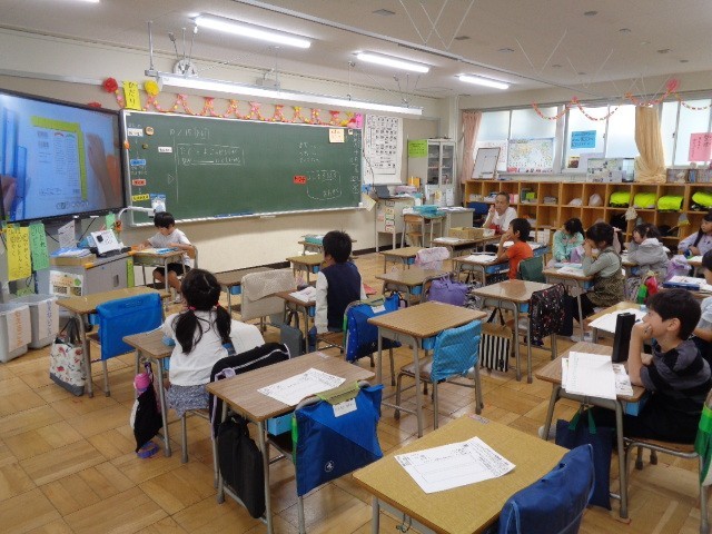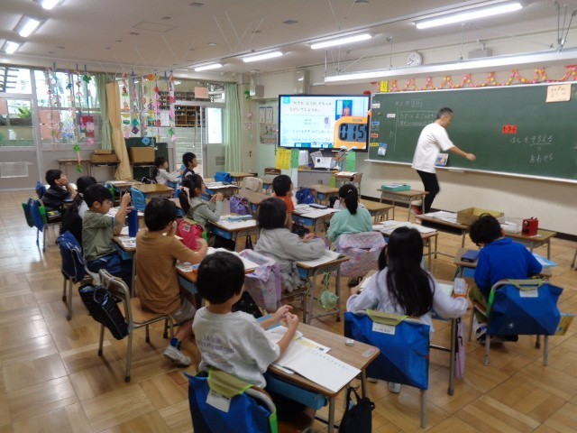 この日の1年生の算数は、「ながさくらべ」の学習でした。いつものように、1年生の各教室とランチルームの3つの教室に分かれての学習でした。今日のめあては「たてとよこをくらべてみよう。」です。本や机の長さをどうやってはかればよいか、みんな一生懸命に考えていました。