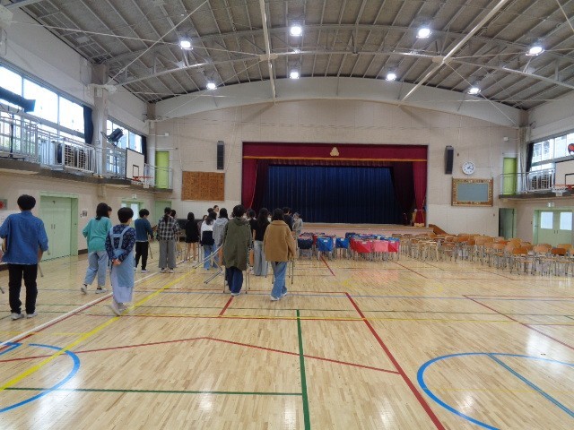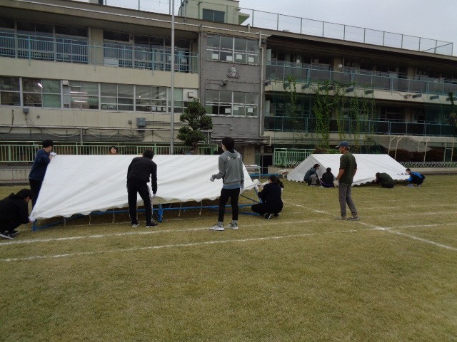 明日に向けて最終確認をしたり、会場づくりをしたりしたのですが、今日は、これから大雨が降るという予報だったので、児童椅子は外には出せず、2階と3階の教室の椅子は体育館とランチルームへ運びました。また、杭を打ったりテントの骨組みを組み立てたりするなど、雨が降っていてもできる準備はしましたが全部の準備はできませんでした。