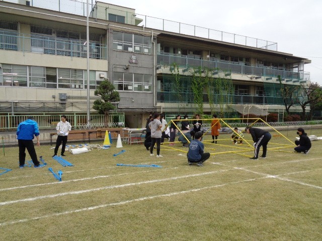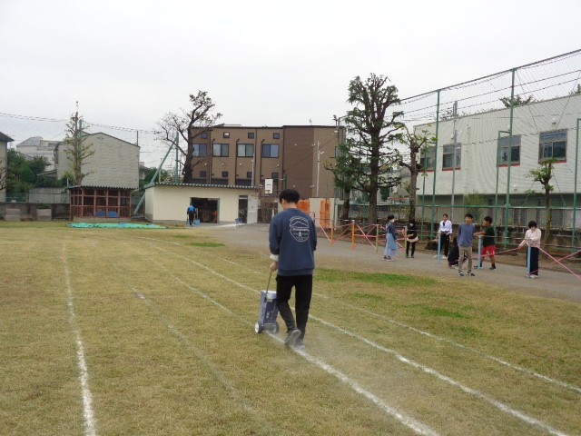 今日は5,6年生の係児童を除いては給食後下校でした。子どもたちが下校した後に先生方と係児童の皆さんで運動会の前日準備をしました。