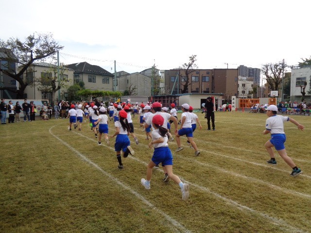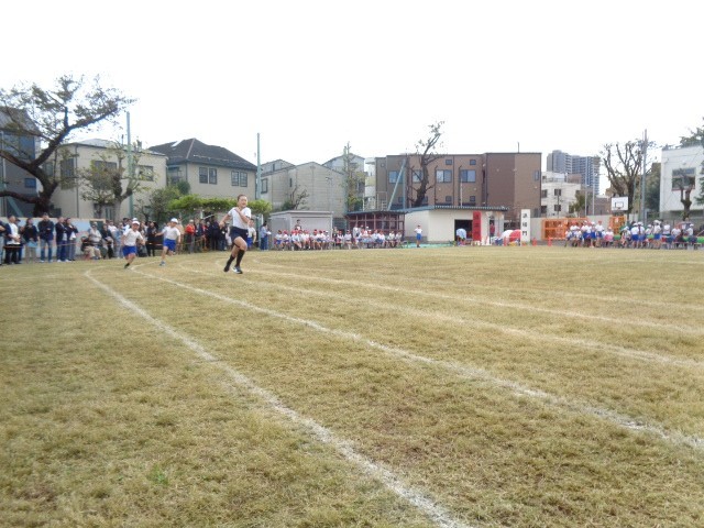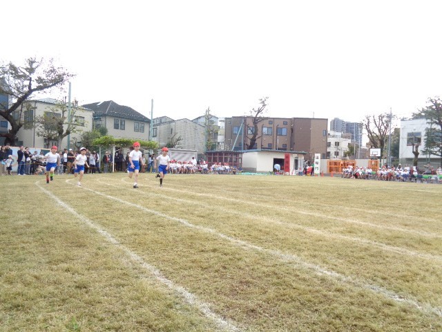 3年生は初めての80m走。初めてのトラックのカーブでした。体を斜めに傾けながら走るのは難しいのですが、どの子も最後まで走り抜けることができました。