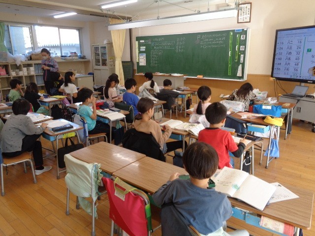 2年生では、今日も3つのグループに分かれて学習していました。今日のめあては、3教室とも「8のだんの九九をおぼえよう。」ということで、子どもたちは頑張って学習していました。