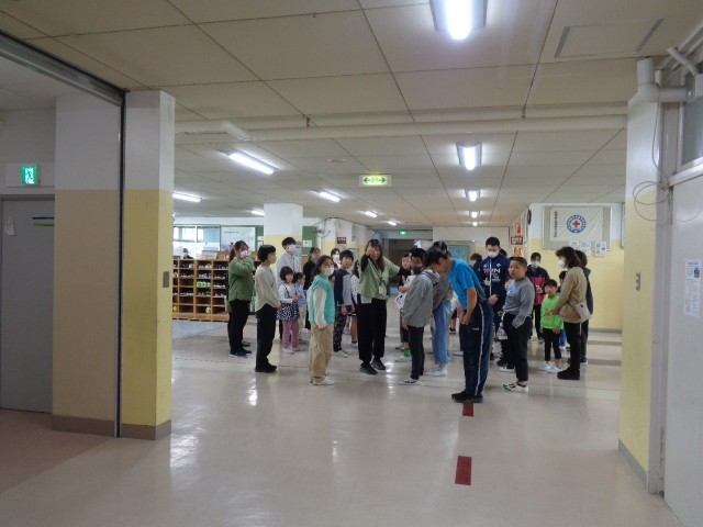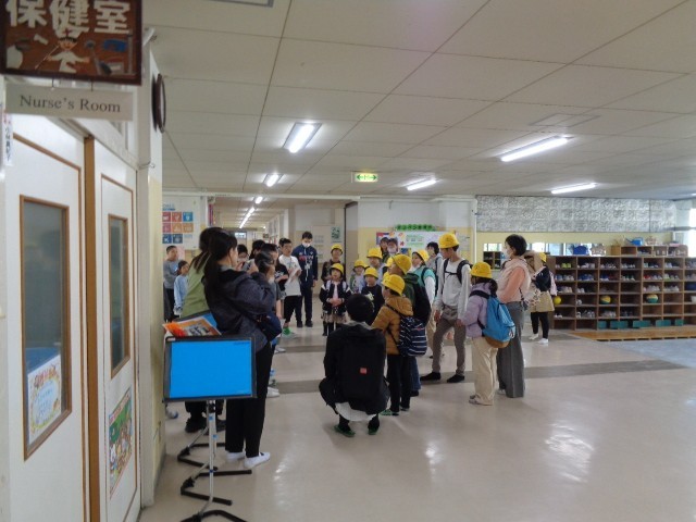 板橋第七小学校まで、歩いて30分くらいかかりましたが、子どもたちは元気に歩くことができました。学校に着くと、板橋第七小学校の子どもたちや先生方が迎えてくれました。簡単に始めの会をして、その後は、グループに分かれて体育館へ移動です。