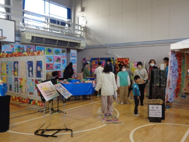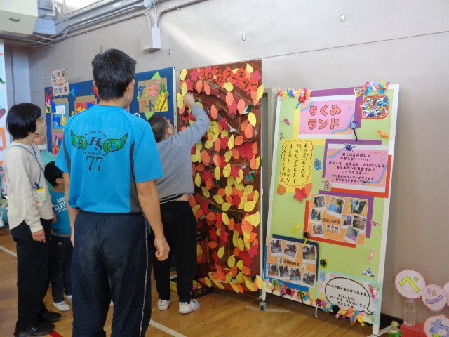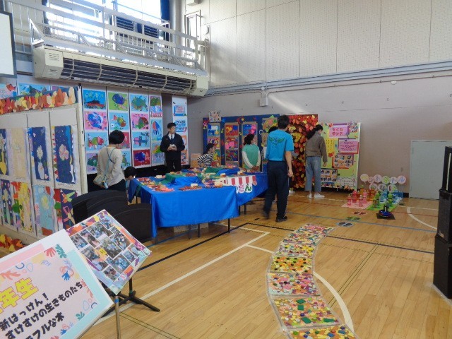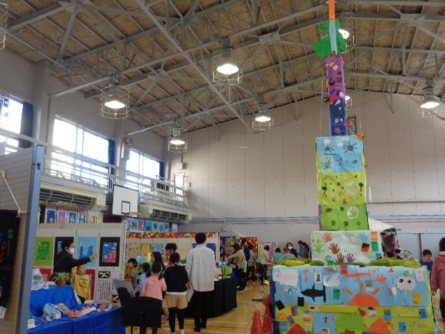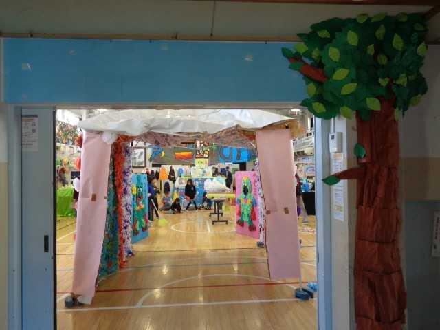 体育館では、たくさんの作品が五組の子どもたちを迎え入れてくれました。グループごとにすべての作品を見て回り、板橋第七小学校の五組の展示場所では遊べるコーナーもあって、子どもたちは楽しみながら見学をすることができました。