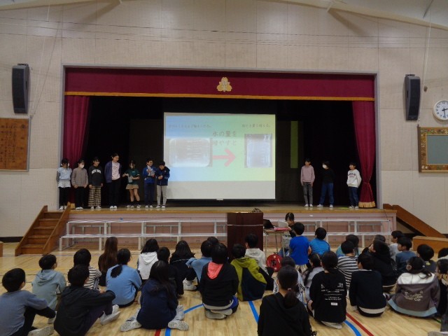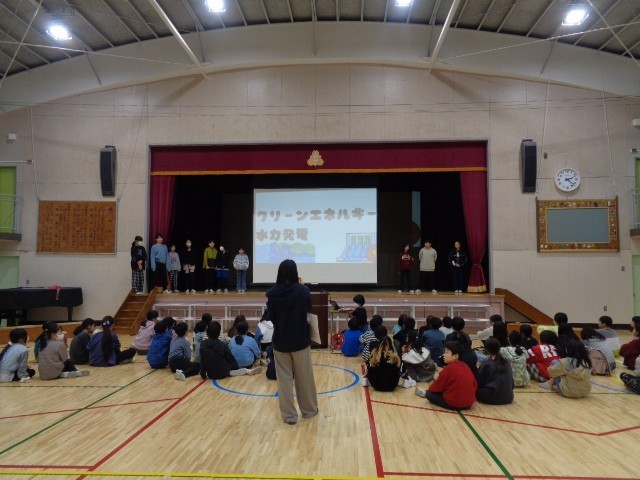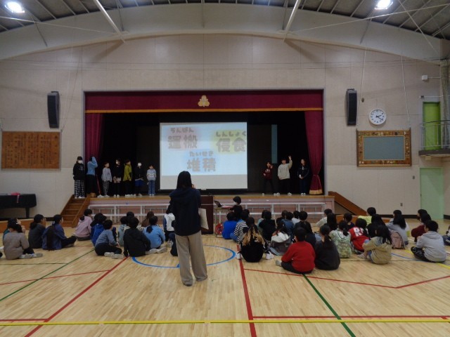今日の6時間めは、5年生が体育館で学習発表会の練習をしていました。