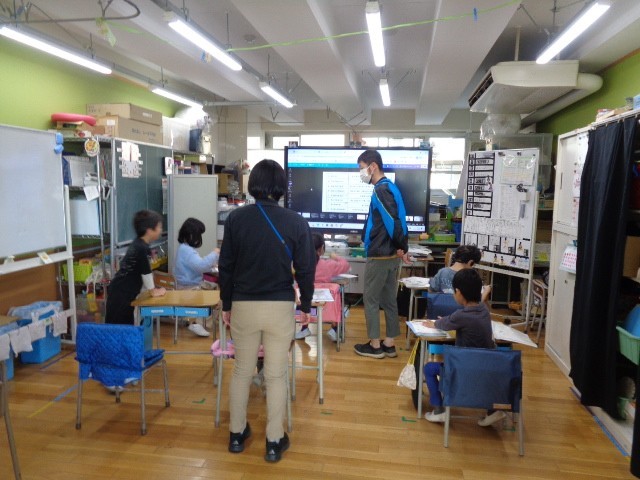 五組では、1時間めの日常活動の時間を使って朝の会をやっています。通常学級よりも丁寧に今日の時間割の確認とか、天気の情報とか健康観察などを行っています。クラスの実態によっては歌を歌ったりスピーチをしたりすることもあります。今日も子どもたちは元気に過ごしています。