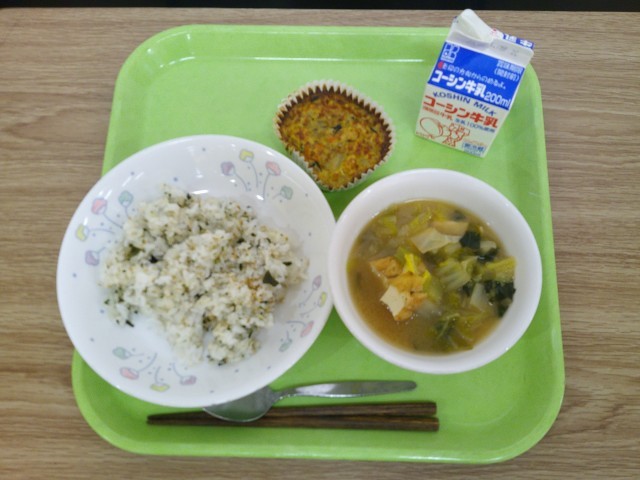 今日は生揚げ入りのみそ汁を用意しました。学校給食では大豆の加工品をよく使います。今日の給食の時間には「大豆や大豆の加工品にふくまれる栄養は、成長過程の子どもたちに必要なものが多いこと」や「油揚げや生揚げがどのように作られるのか」などを子どもたちに伝えました。