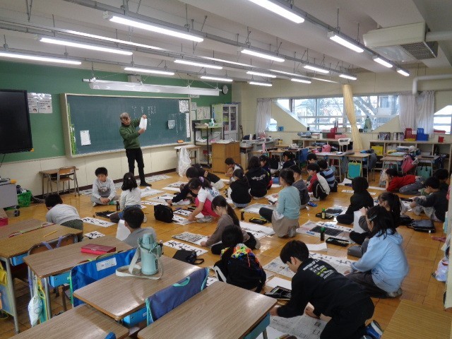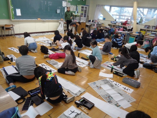 今日の5時間め、3年生は2組が「書写」の授業で、お正月に向けて初めての毛筆での書き初め「友だち」を書くのに、先生からの説明を聞いていました。