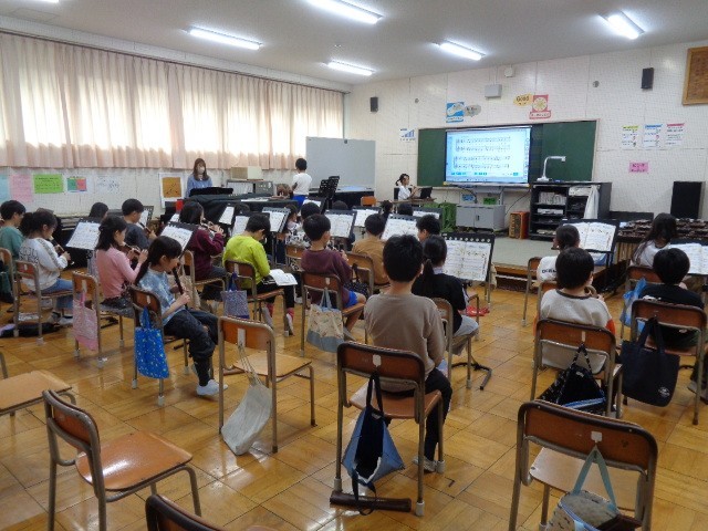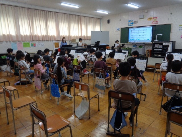 1組は「音楽」の授業で、リコーダーで「メリーさんのひつじ」の曲をみんなで合わせて演奏していました。みんなの音がそろうととてもきれいに聞こえてきました。