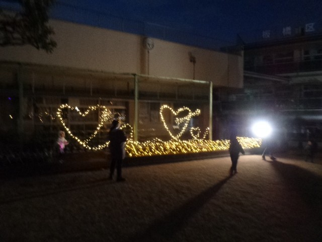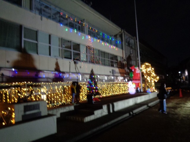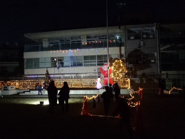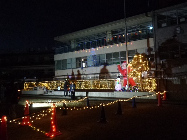 弥生ASOBI隊の皆さんによる「クリスマスイルミネーション」が始まりました。日が暮れて暗くなると、イルミネーションが一層キラキラと輝いていてとてもキレイです。子どもたちや保護者の方々、卒業生の皆さんも集まってきています。