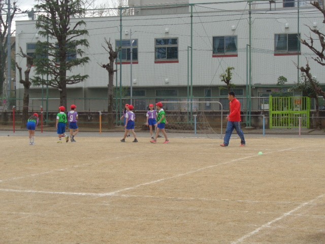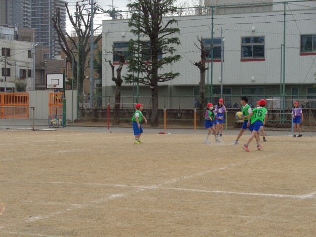 今日の2時間め、校庭では4年2組が体育で「ハンドボール」をやっていました。今日は、ゴールを1つにして、それぞれ攻め方と守り方の練習をしていました。チームのみんなで協力しながらプレーしていました。