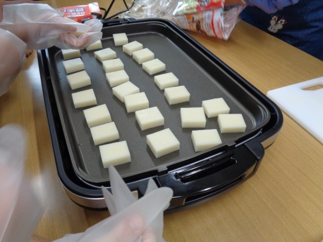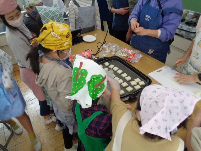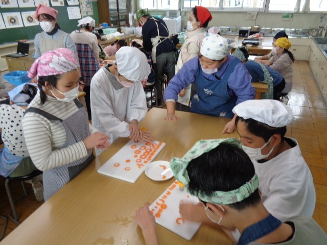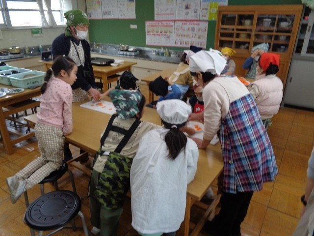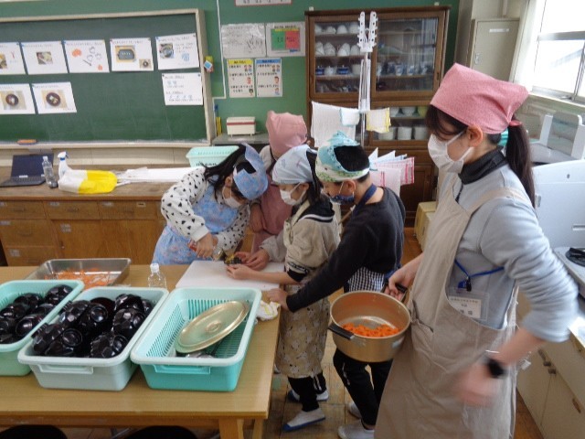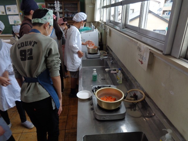 今日の3,4時間め、家庭科室では五組の皆さんが「おぞうにをつくろう」ということで集まっていました。にんじんの型抜きをしたり、お餅を焼いたり、お雑煮の汁を作ったりと、高学年の子どもたちを中心に、先生の助けも借りながら、とてもおいしいお雑煮を作ることができました。できたお雑煮は日ごろお世話になっている方々にも配り、みんなもおいしくいただきました。