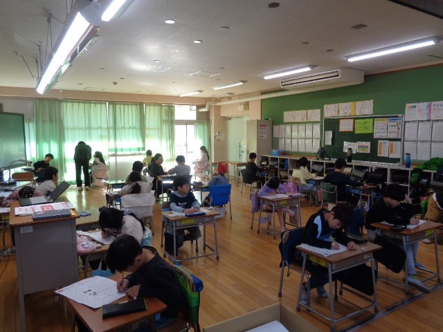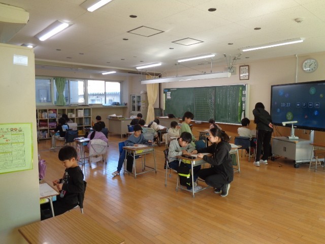5時間め、1組では「あなのやくわり」という説明文を読み取る学習をしていました。2組では、テストをしており、みんな真剣な表情でやっていました。