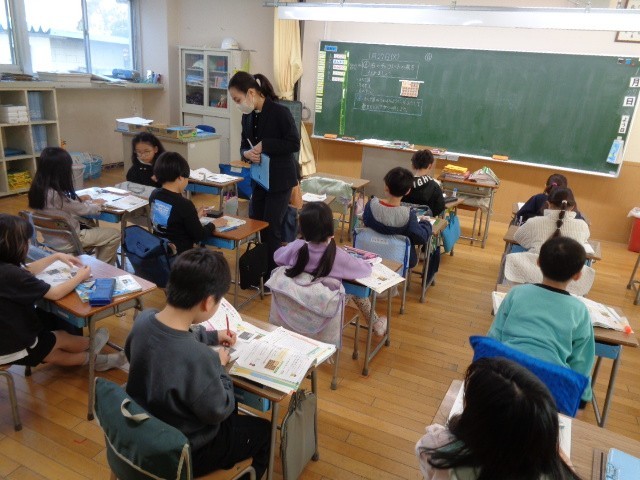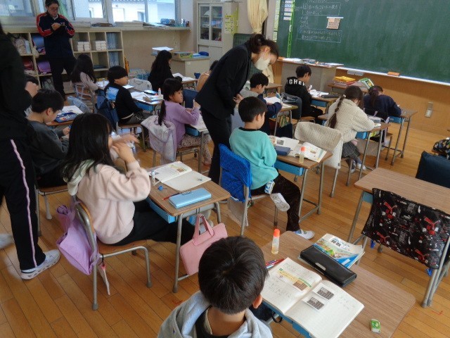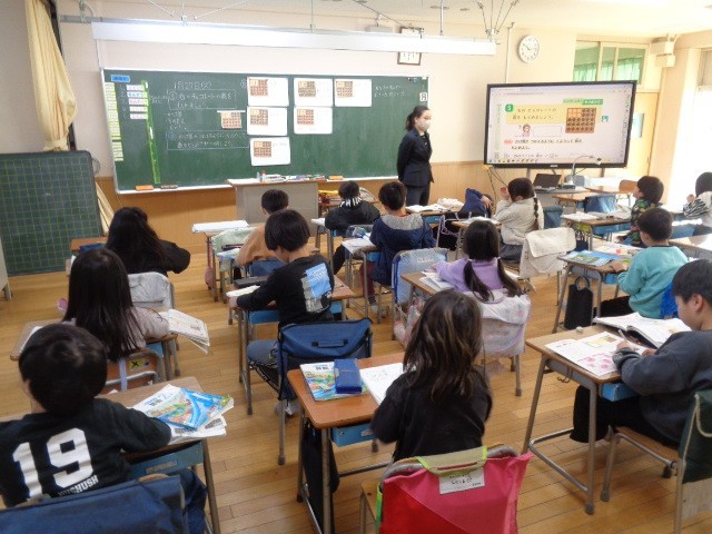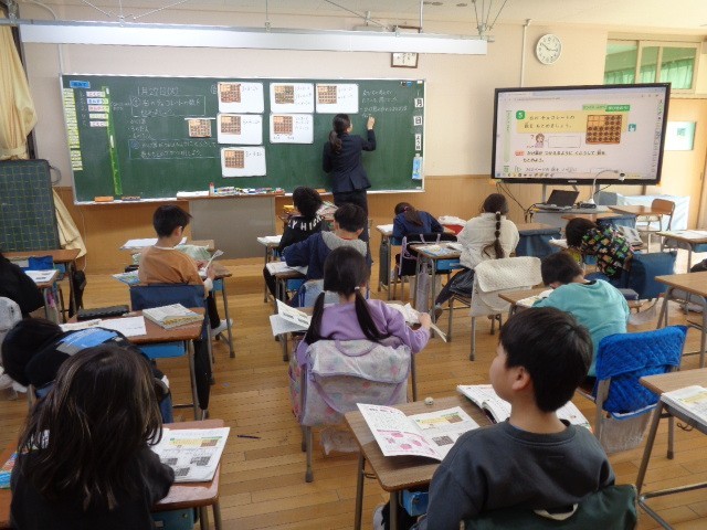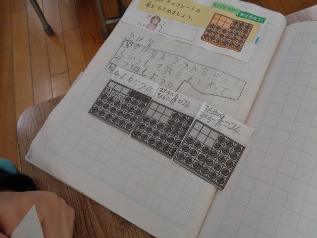 今日の2時間め、2年2組では算数の授業をしていました。今日は、「かけ算のきまり」という単元の学習で、今日の問題は「チョコレートの数はいくつですか。」、めあては「かけ算がつかえるようにくふうして数をもとめてせつ明しよう。」でした。子どもたちは一生懸命に、かけ算を使って工夫して自力解決をしていて、中にはやり方を3つも4つも工夫して解決していた子もいました。