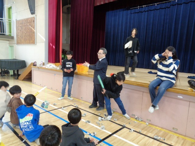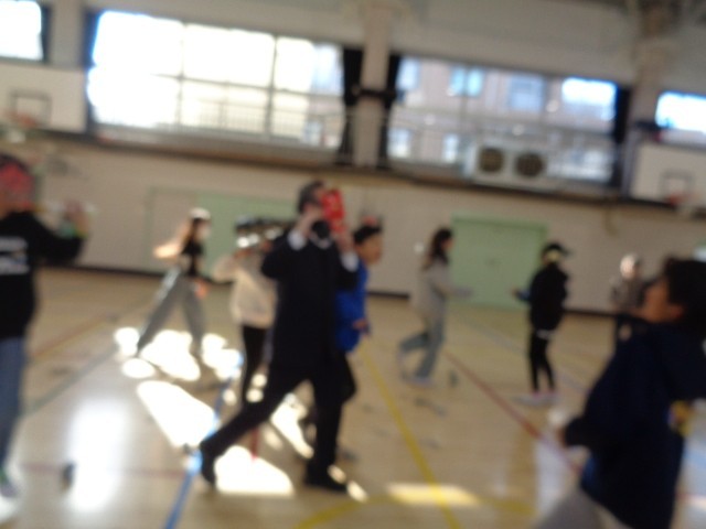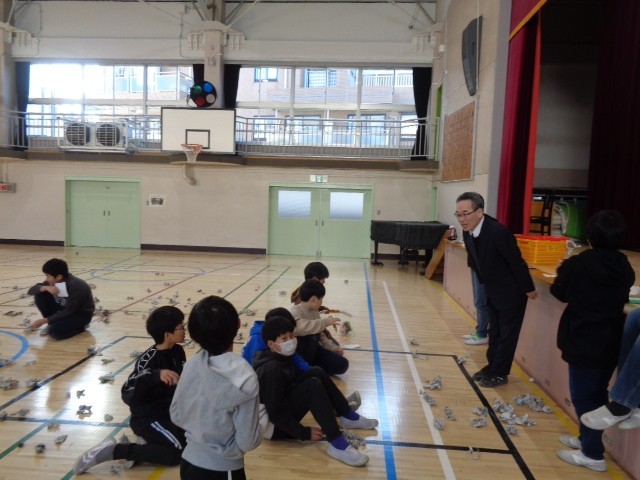 今日の6時間め、5年1組が体育館で豆まきをやっていました。豆まきと言っても、子どもたちが自分たちで考えて、痛くないように、新聞紙を小さく切って丸めて「豆」にしたものを投げるというものでした。また、2人の子どもたちが鬼役となり、鬼が体育館の扉を開けて中に入ったら、一斉にみんなで鬼に「鬼は外!」「福は内!」と豆まきが始まりました。