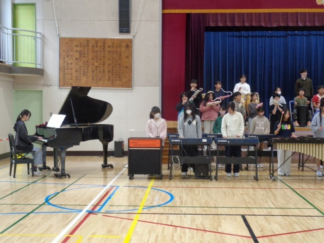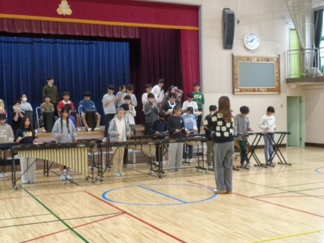 今日の5時間め、体育館から音楽が聞こえてきたので行ってみると、6年生が明日の6年生を送る会のために「贈りもの」の練習をしていました。今日は最終練習ということで、子どもたちも気合十分で練習をしていました。静止画なので音は聞こえませんが、明日はどんな演奏を聴かせてくれるのか楽しみですね。