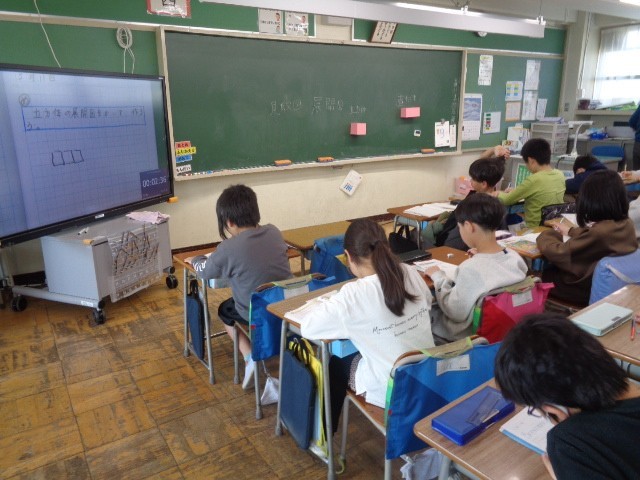 4年生は二クラスとも算数でした。「箱の形の特ちょうを調べよう」で、立方体の展開図をつくる学習でした。