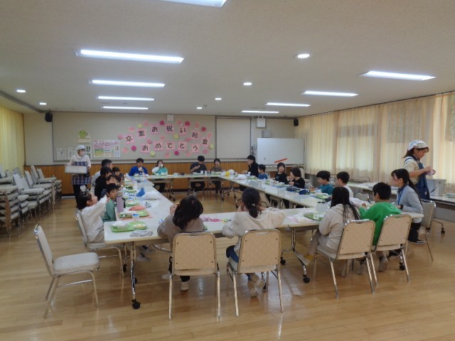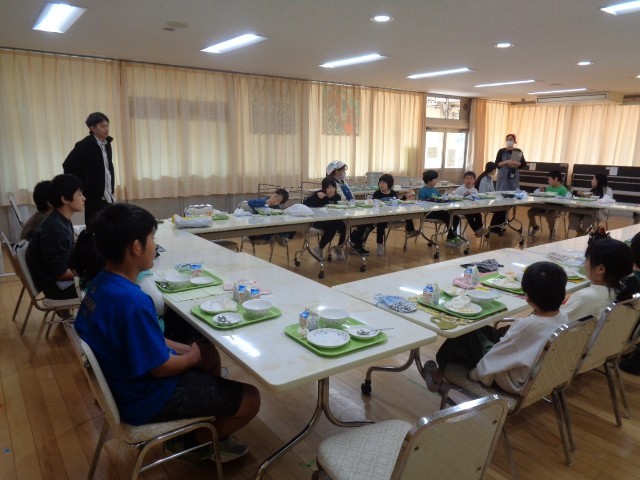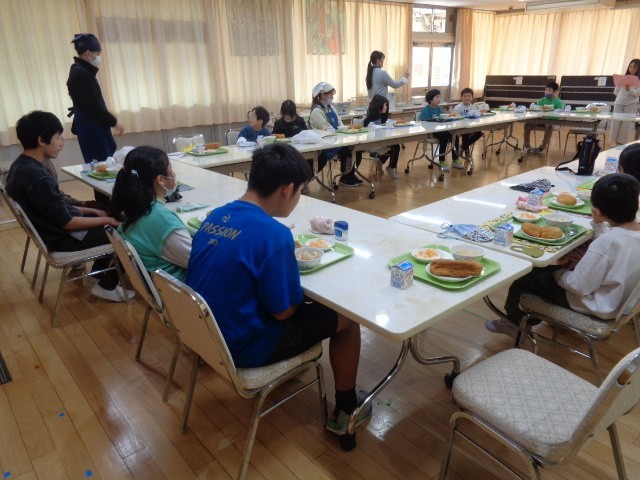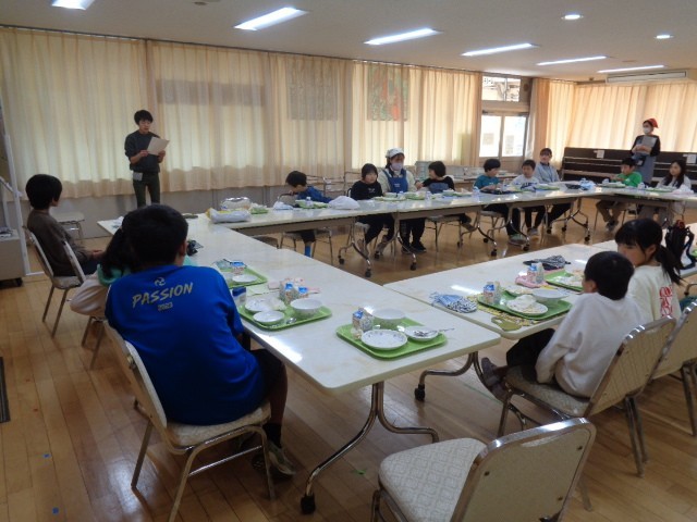 給食の時間は、五組のみんなでランチルームで給食を食べました。みんな大好きなメニューだったこともあり、食缶の中はほとんど空っぽになりました。