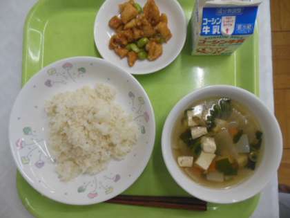 山口県の料理をイメージした給食です。ゆうれいずしは、一見白いごはんですが、すし酢とさわらのほぐし身が入って意外なおいしさです。チキンチキンごぼうは、味はもちろん名前のリズムも良く、子どもたちが喜んでいました。けんちょう汁は野菜とだしのうま味が濃厚でとてもおいしかったです。