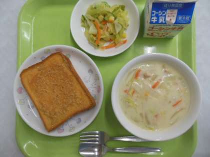 ねりごまトースト 白菜のクリームシチュー コールスロー 牛乳