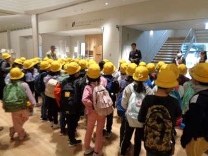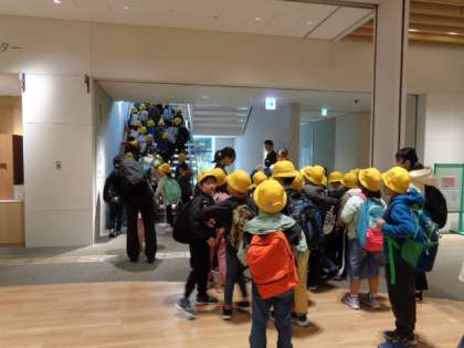 中央図書館に着いた後はみんなで1階のロビーに集まり、館長さんの話や見学での注意事項について説明を受けました。いよいよクラスごとに分かれて図書館見学の出発です。