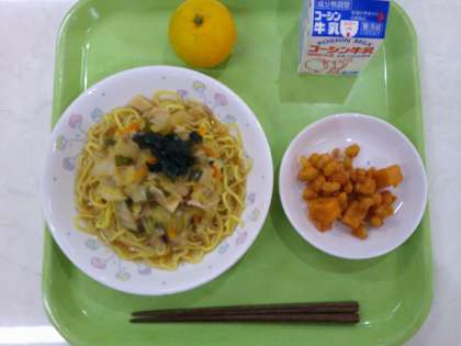 五目わかめラーメン 鉄ちゃんビーンズ みかん 牛乳
