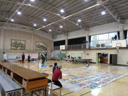 写真は、その後の放課後の様子です。先生方が一つ一つの作品を展示していきます。体育館がどのような美術館に変わっていくのか、これからが楽しみです。