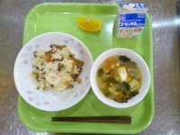 今日の献立はガーリックライス・タンドリーチキン・マカロニスープです。ガーリックライスはベーコンの塩味とにんにくの風味がおいしく感じられ、児童にも人気がありました。タンドリーチキンは、調理師さんが朝からカレー粉やヨーグルトに鶏肉を漬け込み、おいしく仕上げてくださいました。