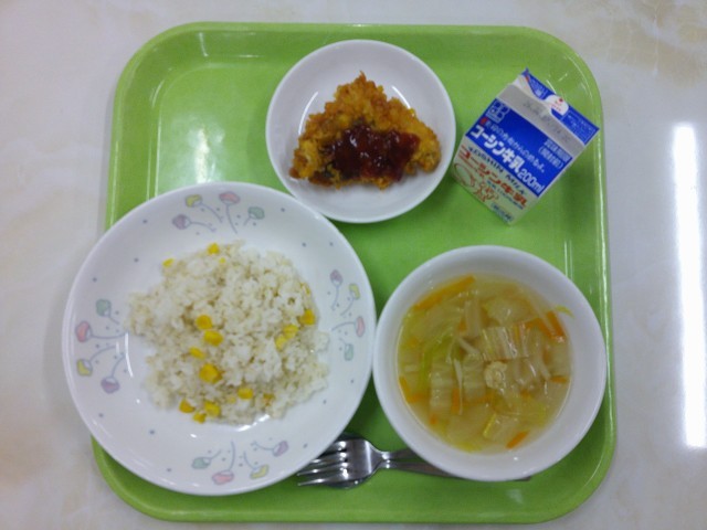 牛乳コーンライスクリスピーフィッシュ野菜スープ今日の給食の「クリスピーフィッシュ...