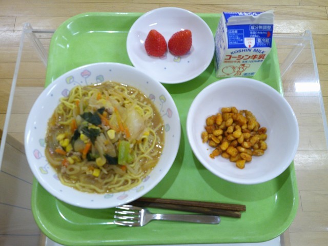 牛乳みそラーメン大豆とポテトのフライいちご今日の給食の「みそラーメン」は、2学期...