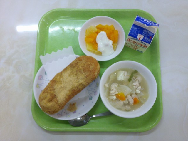 牛乳きな粉揚げパン参鶏湯風スープフルーツヨーグルトかけ今日の給食は6年生のリクエ...