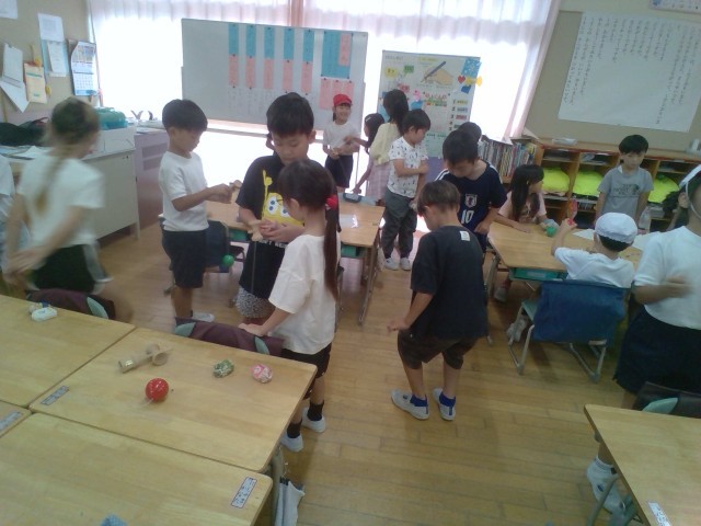生活科の時間、1年生に3つの昔遊び「おはじき・お手玉・けん玉」を教えに行きました。