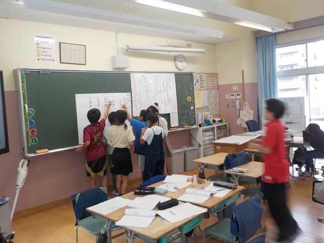 この日は学習のはじめの段階として、物語の段落ごとに、あらすじを要約する学習に取り組んでいました。ここでは自己調整型の学習に挑戦。子供たちがこの時間の学習の計画を立てて、そのあと自分立てた計画を達成するために、最適と思う学習の形態を自分で選んで学習が始まりました。一人で取り組む子もいれば、グループを組んで学習を始める子、先生の説明を聞いて取り組む子、オープンスペースで考える子など、様々です。子供たちは教科書の本文に書かれている内容や言葉に着目しながら、段落のあらすじについて話し合っていました。それぞれ話し合った内容を付箋に書いて黒板に貼り、全体で友達の考えを参考にできるよう工夫もあり、みんなで学びを深めている様子が見られました。