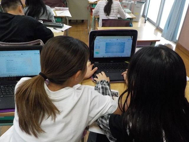 この日は全体の2時間目ということで、1時間目に立てた学習問題や学習の課題に沿って、調べ学習を始めたところで、この後6時間程度を使って調べ、まとめていく予定です。自己調整型学習ということで、自分で決めた学習計画に沿って、場所や学習形態を選択しながらタブレットやノートなど、思い思いの方法で自動車工場の様々な工夫について調べ、学んでいました。