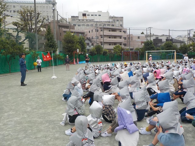 今月の避難訓練は火災設定です。主事室からの出火の想定で、校舎片側の階段が使用できないため、非常階段も使用する想定で避難訓練を行いました。児童の避難は毎回スムーズですが、この日も静かに5分以内で避難が完了し、消防署の方にその避難の様子を褒めていただきました。