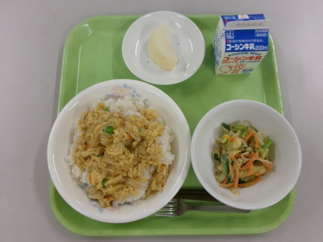 10月16日(木)の給食 公開日 2025/10/18 更新日 2025/10/17 給食献立 今日の献立は【変わり親子丼 アーモンド和え 梨 牛乳】でした。☆食材の産地☆ 玉ねぎ:北海道 にんじん:北海道 鶏卵:青森県 キャベツ:群馬県 もやし:栃木県 青菜:埼玉県 鶏肉:宮崎県 梨:新潟県