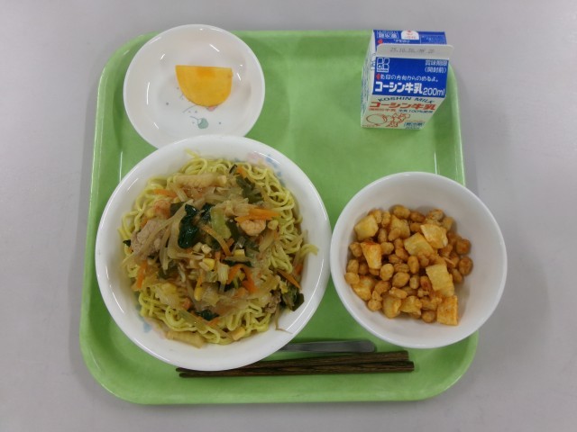 【北海ラーメン 大豆とポテトのフライ 柿 牛乳】でした。