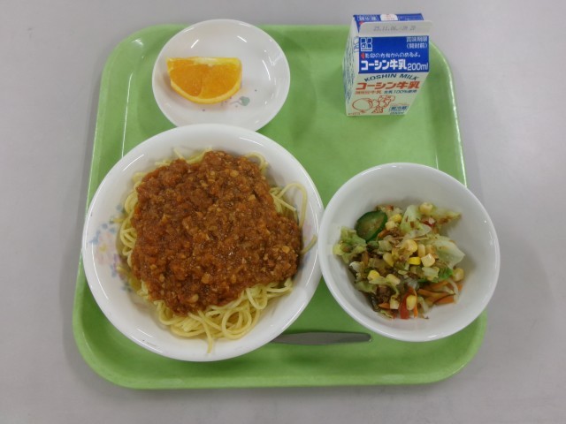 10月29日(水)の給食 公開日 2025/10/30 更新日 2025/10/29 給食献立 今日の献立は【スパゲッティミートソース りっちゃんの元気サラダ オレンジ 牛乳】でした。☆食材の産地☆ 玉ねぎ:北海道 にんじん:北海道 にんにく:青森県 セロリ:長野県 キャベツ:群馬県 豚肉:群馬県 レタス:茨城県 きゅうり:埼玉県 パプリカ:山梨県 オレンジ:アメリカ