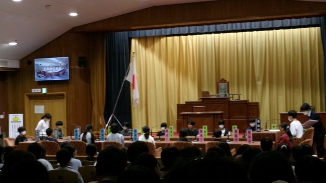 テレビで見る国会の舞台を実際に目の当たりにすることができました。国会では、参議院特別体験プログラムにも参加して、本校と他2校合同で、実際に参議院で法案が可決されるまでの模擬委員会と本会議を体験することができました。今回の審議法案は「身体障害者補助犬法案」です。代表の児童が委員長や衆議院議員、委員などの役職を体験し、傍聴席からは法案に賛成反対の票を投票する体験もできました。