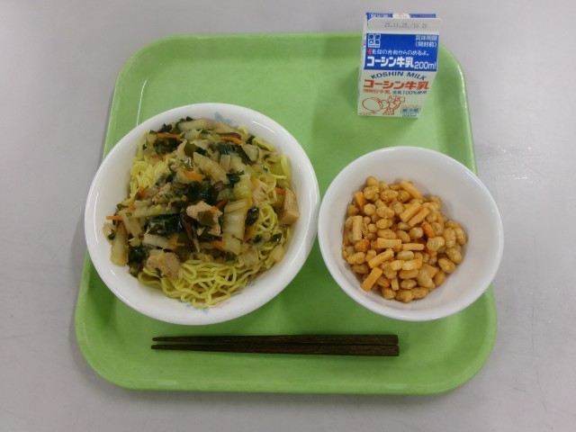 11月17日(月)の給食 公開日 2025/11/17 更新日 2025/11/17 給食献立 今日は<鉄強化献立>です。献立は【五目わかめラーメン 鉄ちゃんビーンズ 牛乳】です。☆食材の産地☆ いか:ペルー 大豆:北海道 にんじん:北海道 にんにく:青森県 鶏肉:岩手県 長ねぎ:栃木県 青菜:群馬県 白菜:茨城県 しょうが:高知県