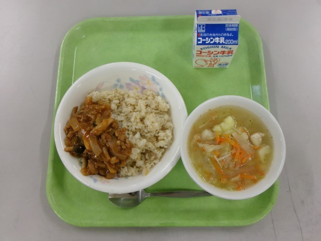 11月28日(金)の給食 公開日 2025/11/29 更新日 2025/11/29 給食献立 今日の献立は【ガーリックライス ポークチャップ 野菜スープ 牛乳】でした。☆食材の産地☆ じゃがいも:北海道 玉ねぎ:北海道 にんにく:青森県 豚肉:秋田県 しめじ:長野県 えのきたけ:長野県 にんじん:千葉県 セロリー:静岡県 キャベツ:愛知県 鶏肉:宮崎県