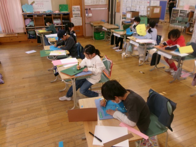 作品展に向けて続々と作品が仕上がってきています。 立体作品では、カッターナイフを使い、カラフルな建物ができてきています。平面作品では「大きく育てびっくり野菜」をさらに発展させていきます。作品の見てほしいところや工夫したところを考え、作品カードも作りました。作品展が待ち遠しいです!楽しみにしていてください。