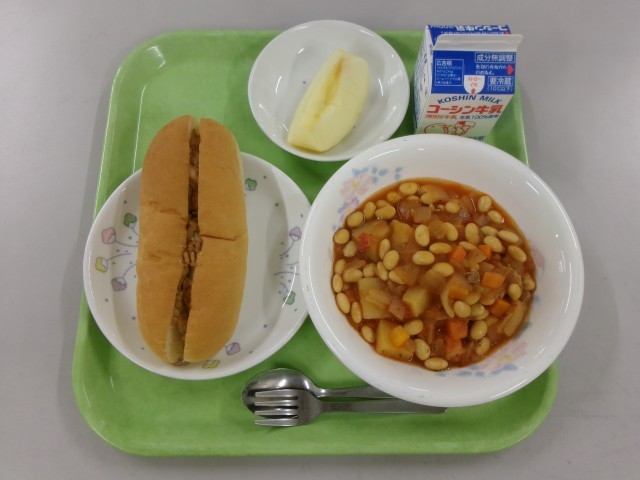 12月8日(月)の給食 公開日 2025/12/08 更新日 2025/12/08 給食献立 今日の献立は【ツナドック ポークビーンズ りんご 牛乳】でした。☆食材の産地☆ 玉ねぎ:北海道 じゃがいも:北海道 セロリー:長野県 豚肉:群馬県 にんじん:千葉県 りんご:岩手県